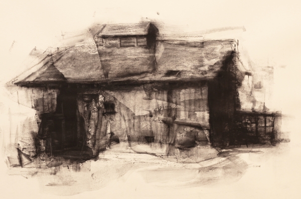 barn 3-4-17, 8x13in, charcoal on paper and transparent gesso, 2017
